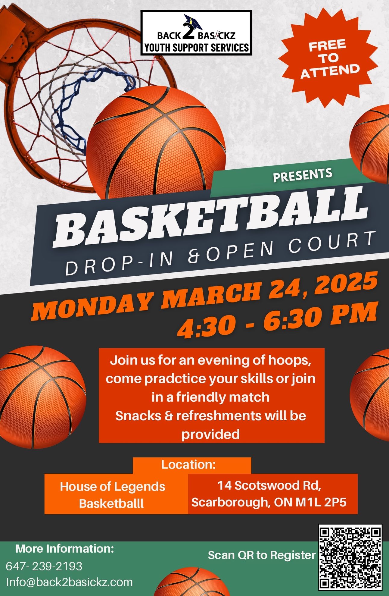 ![]() March 24th, 2025 @ 4:30 p.m. | Calling all young athletes! Back 2 Basickz drop-in Basketball evening from 4:30 - 6:30 pm is back. Sharpen your skills, make new friends, and finish the evening up with a friendly match. This workshop will be hosted offsite at House of Legends indoor courts. Refreshments will be provided. Come hoop it up with us! |