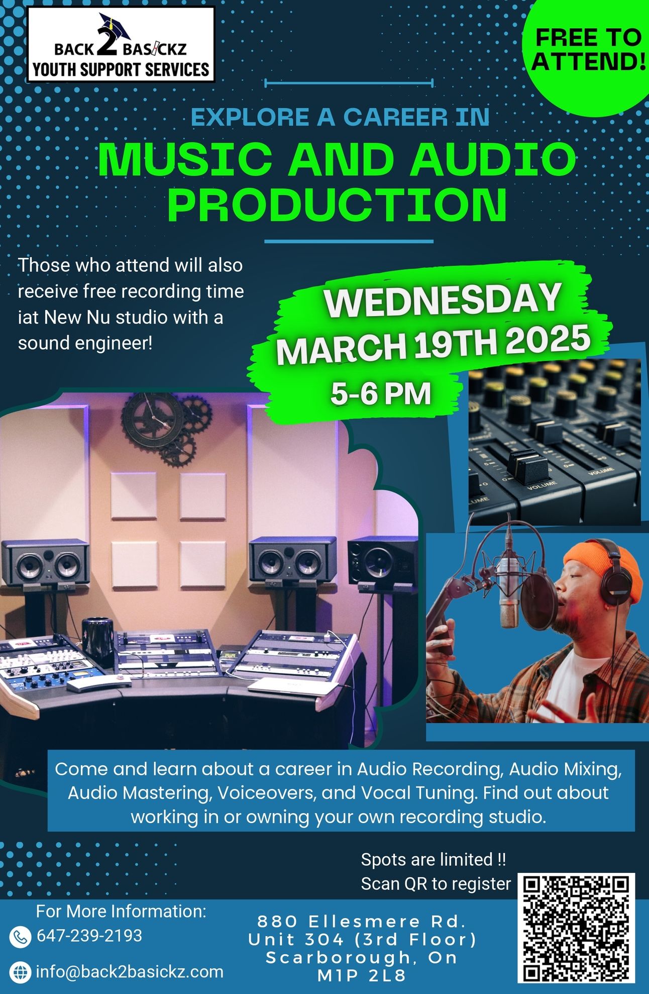 ![]() March 19th, 2025 @ 5:00 p.m. | Career Workshop: Sound Engineer / Recording Studio Come and find out all about entrepreneurship and what it takes to work in sound engineering, and recording. Youth who attend the workshop will get to secure recording time and lessons in an actual studio to record their own track! |