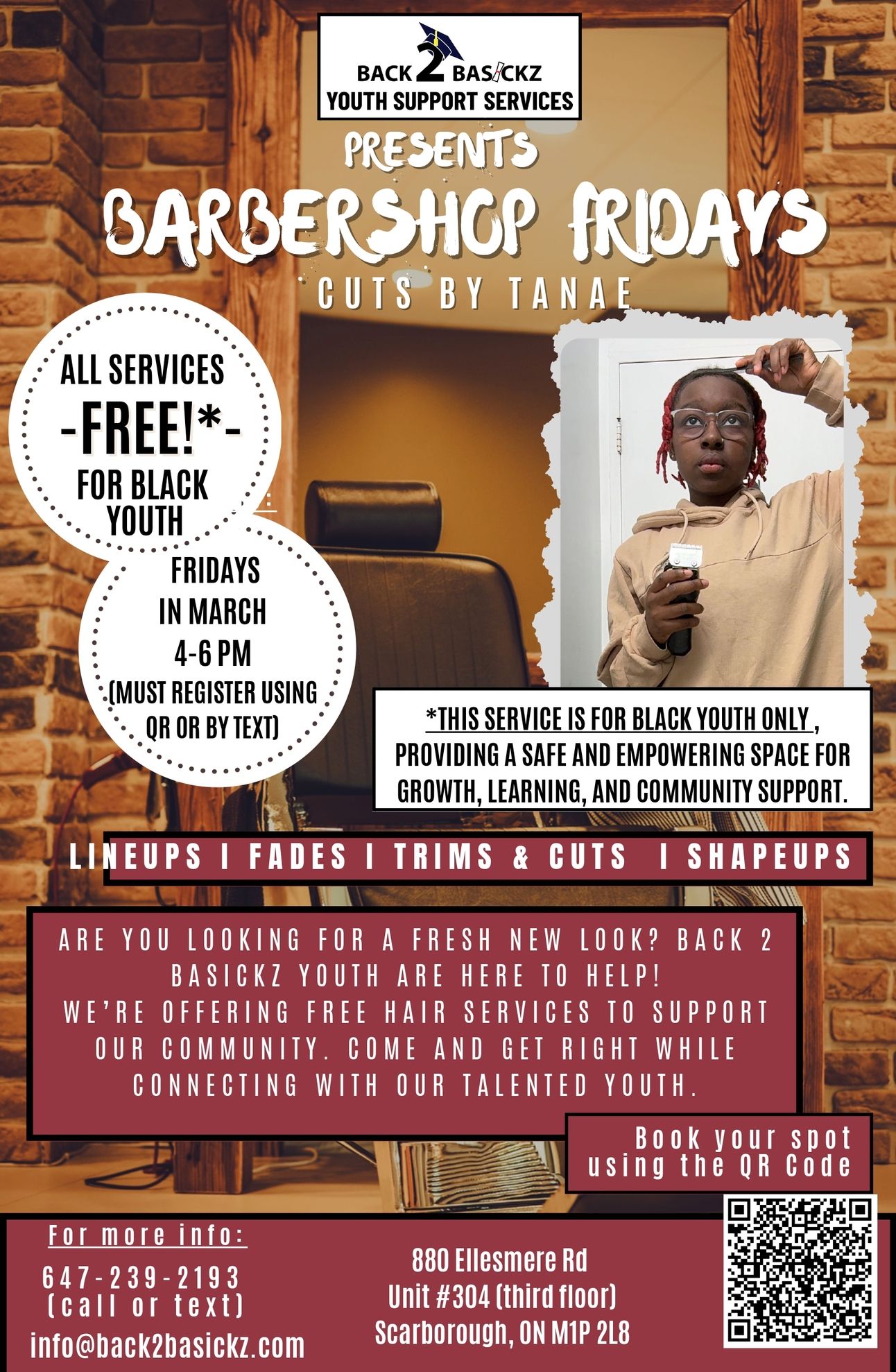 ![]() March 14th & 28th, 2025 @ 4:00 p.m. | Fridays are for Fades!! Register and come by to the B2B Barbershop. Fresh cuts, Fades, trims & Lineups provided by Back 2 Basickz very own talented youth Tanae. |