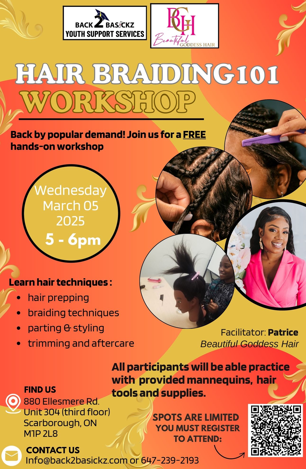 Hair Braiding 101 Workshop Back by popular demand! Come and learn hair braiding techniques (single braids, twists and parting techniques) using supplied mannequins and styling products! Spots are limited, so register now! | ![]() March 5th, 2025 @ 5:00 p.m. |